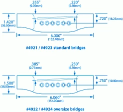 Oversized bridges have a slightly larger footprint to cover any finish chips or damage on the guitar top around the perimeter of the old bridge’s outline.