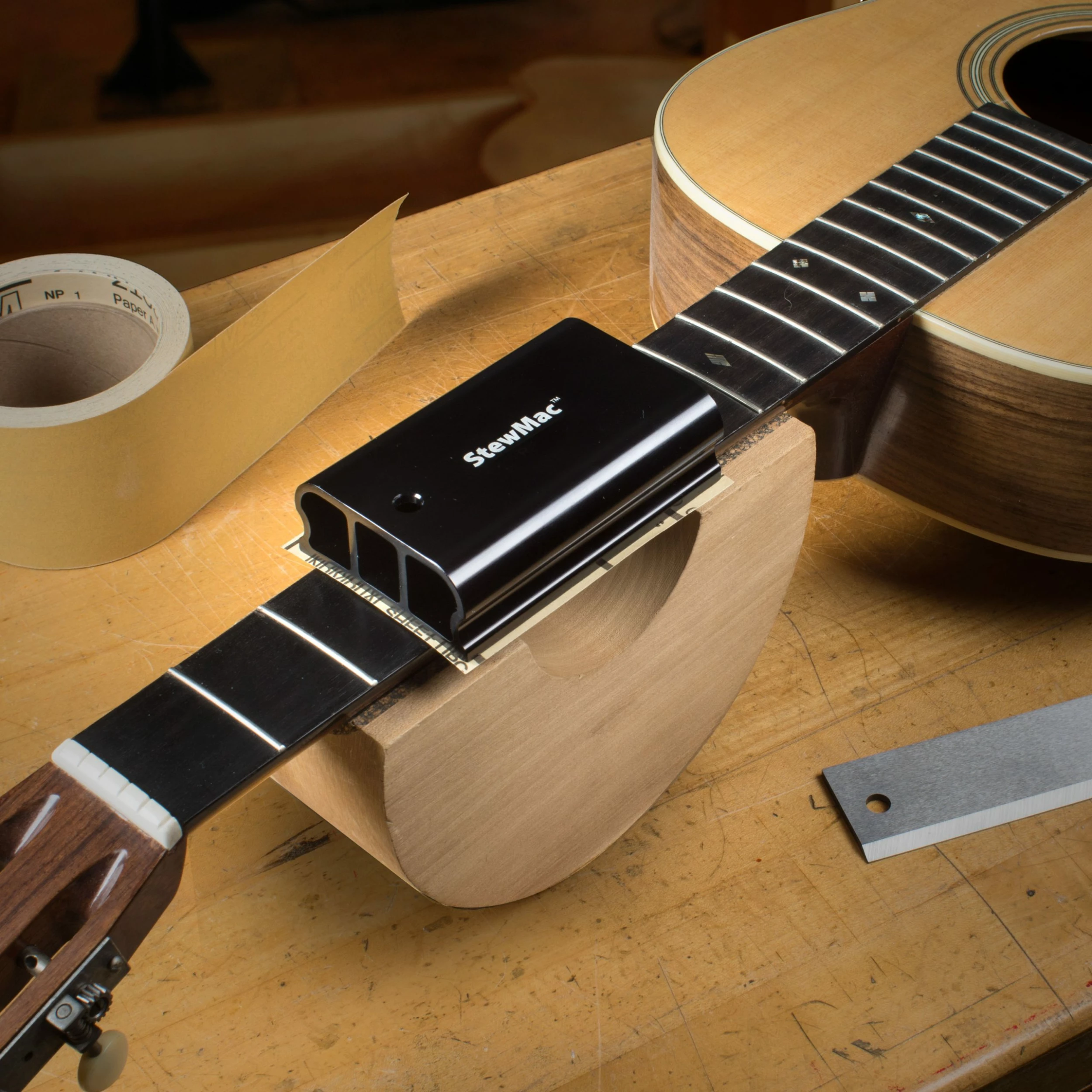 3M Stikit Gold Paper Self-adhesive Abrasives are the right width for our leveling and radius sanding tools. Attach 80 through 220-grits for radiusing and leveling the fingerboard, and 220 through 400-grits for leveling the frets.