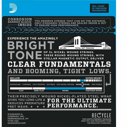 D’Addario XL Nickel Wound Electric Bass strings are world-renowned as “The Player’s Choice” amongst bass players of all genres and styles. All XL strings are precision wound on our exclusive digitally-controlled machines, ensuring each string has excellent intonation, clear fundamentals, and unparalleled consistency. Each string is wound with a nickelplated steel wrap wire known for distinctive bright tone with excellent magnetic output delivering a universally appealing and versatile tone for all playing styles.