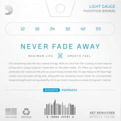 “Born from our greatest breakthrough in string innovation, XS Phosphor Bronze strings have the longest life of any D’Addario acoustic guitar string. The XS coating gives our warm, balanced phosphor bronze strings maximum life, with an uncommonly smooth feel. Made with a NY Steel core, phosphor bronze wrap wire, and Fusion Twist technology—XS coated acoustic guitar strings have incomparable break strength and tuning stability and dramatically increased lifespan.”