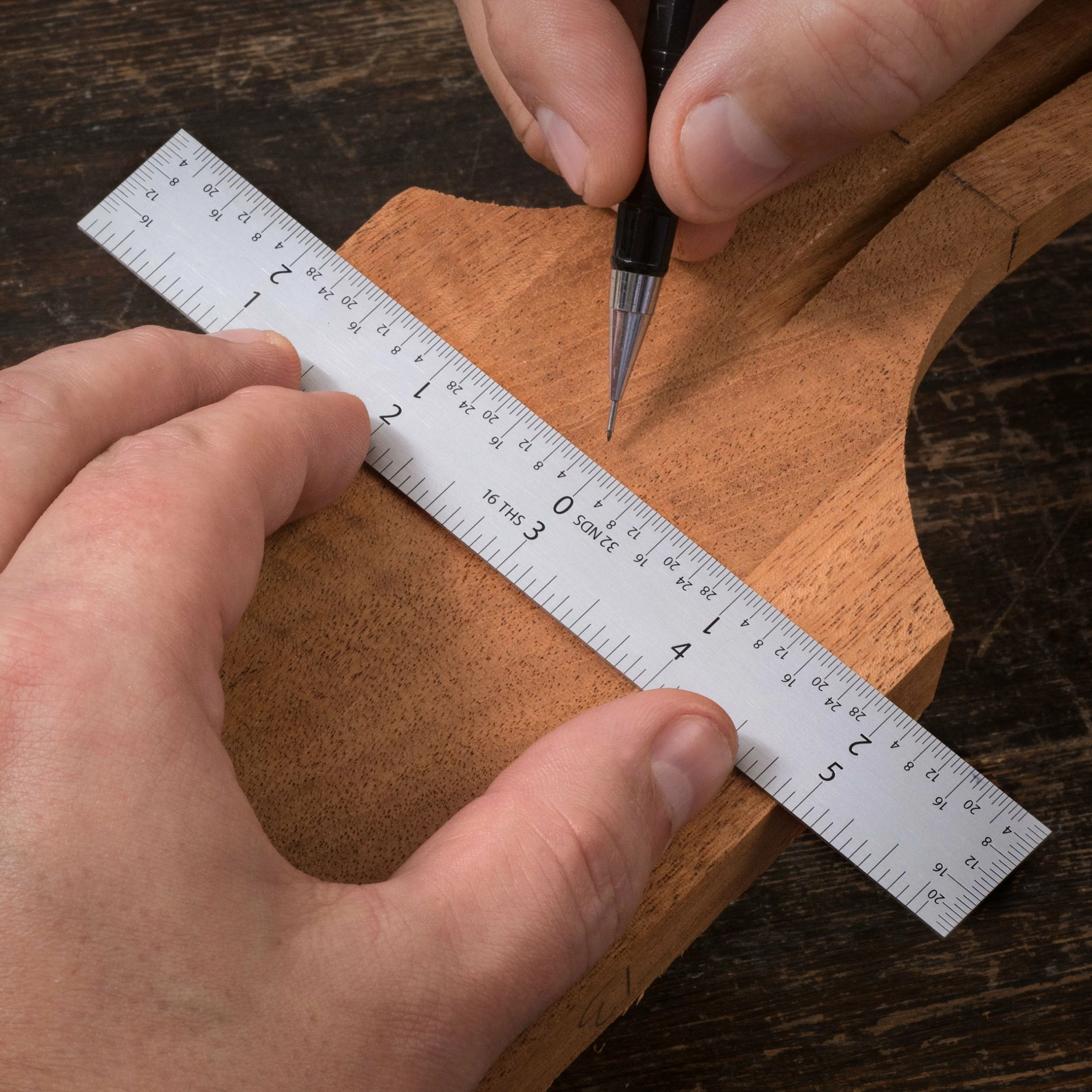 An accurate ruler is the most important tool you’ll own for building. When you are getting into building, the smallest details matter. Our Shop Rule is designed for working on guitars—it has precise measurements down to 1/64″ for accurately measuring the height of nuts, saddles, pickups, and more. The back is a centering rule so you can locate the center of a neck or bridge saddle quickly and precisely.