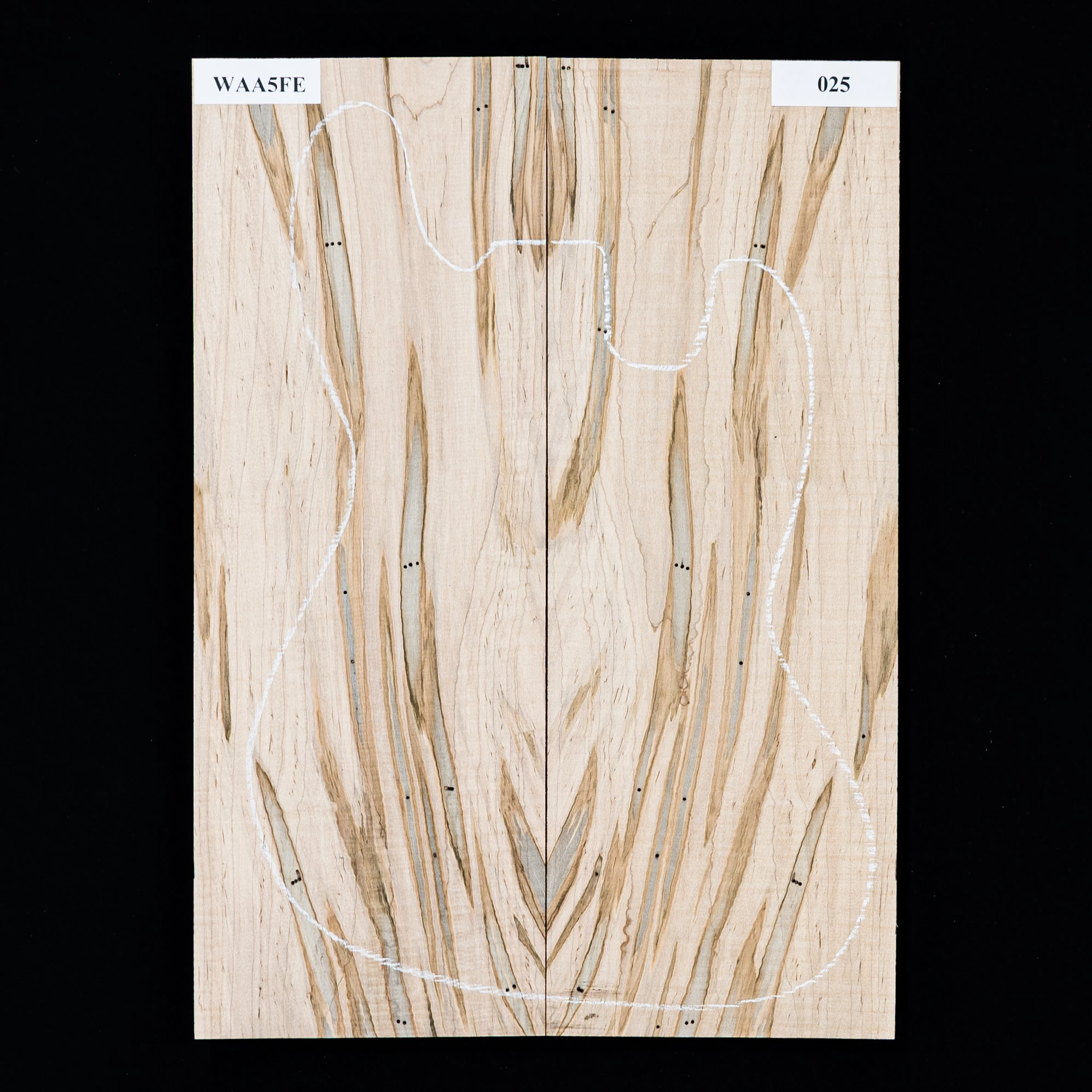 While Ambrosia Maple shares the same species with other well-known maple tonewoods, it’s the look that sets this wildly uncommon wood apart from quilted or flamed varieties. The one-of-a-kind patterning is the result of tunneling by tiny Ambrosia Beetles. Fungus that grows in the tunnels causes beautiful streaks of blue, gray, and brown. The beetles and fungus don’t affect the structural integrity of the wood, and the drying process terminates any remaining beetles or fungus.
