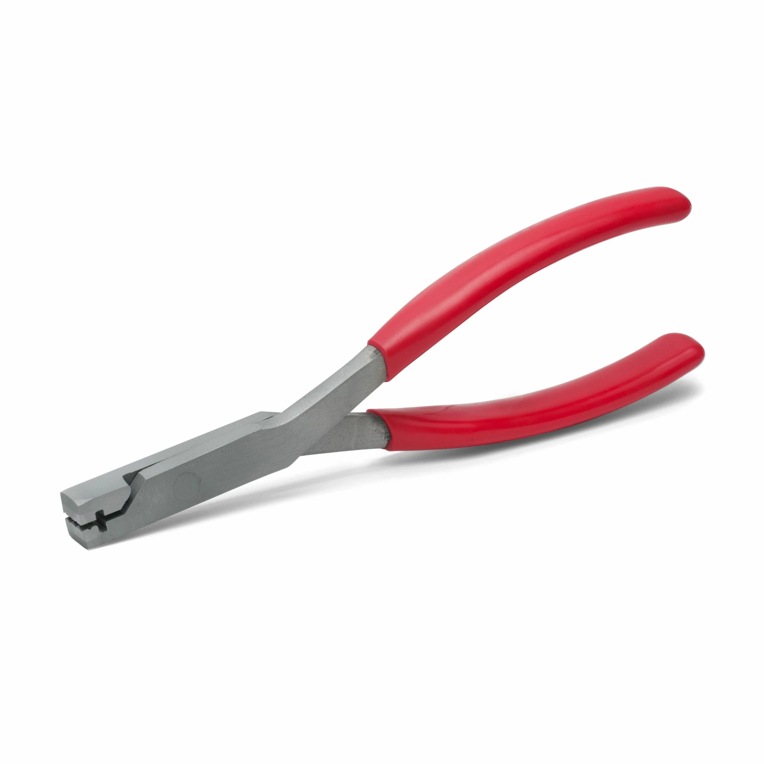 Crimps the tang to fit oversize fret slots. Hardened steel jaws press slight scallops into a fret tang to fit an oversize slot.