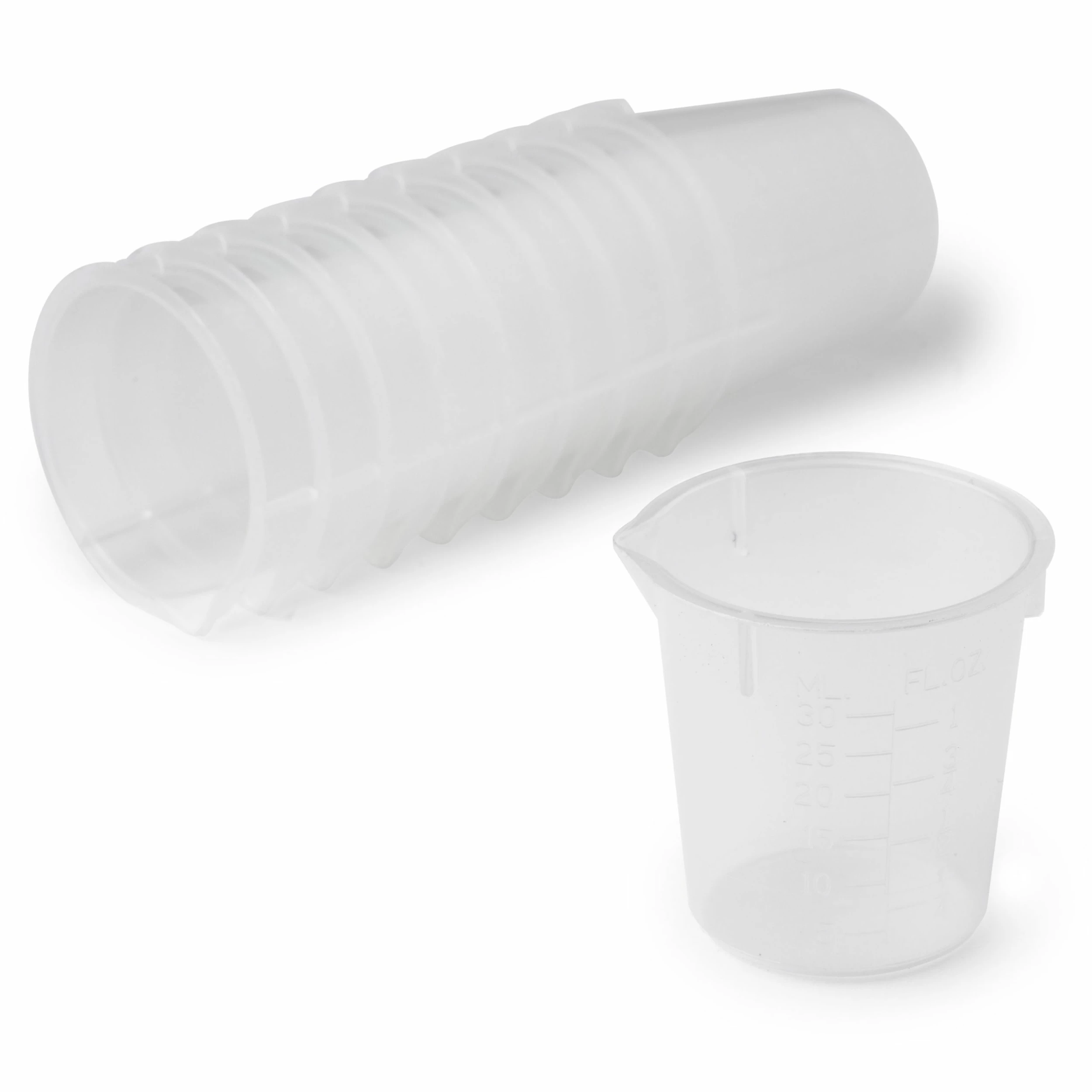 1-ounce plastic mixing cups, graduated for precisely measuring and mixing stains. Safe for use with lacquer thinner and alcohol (acetone solvent, too).