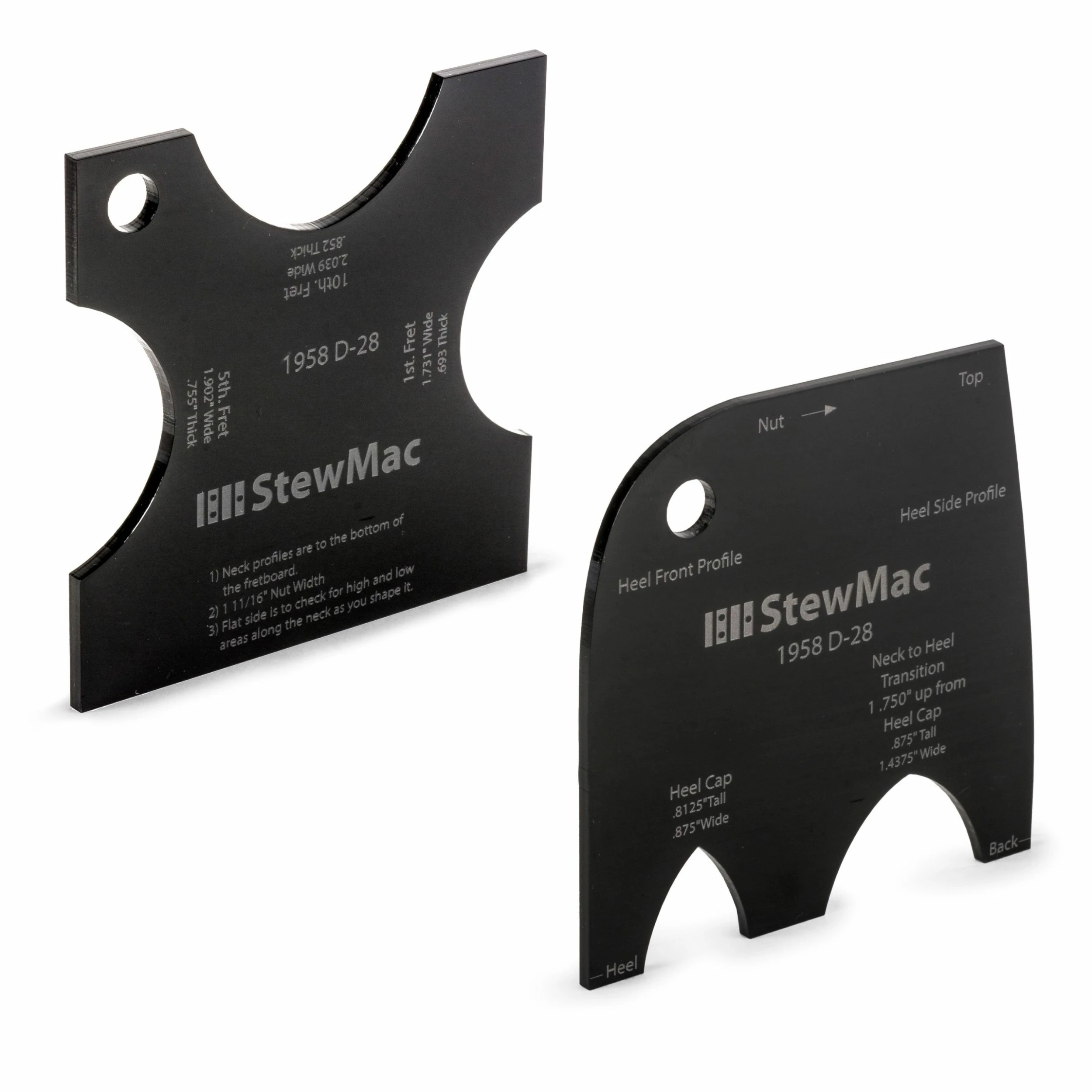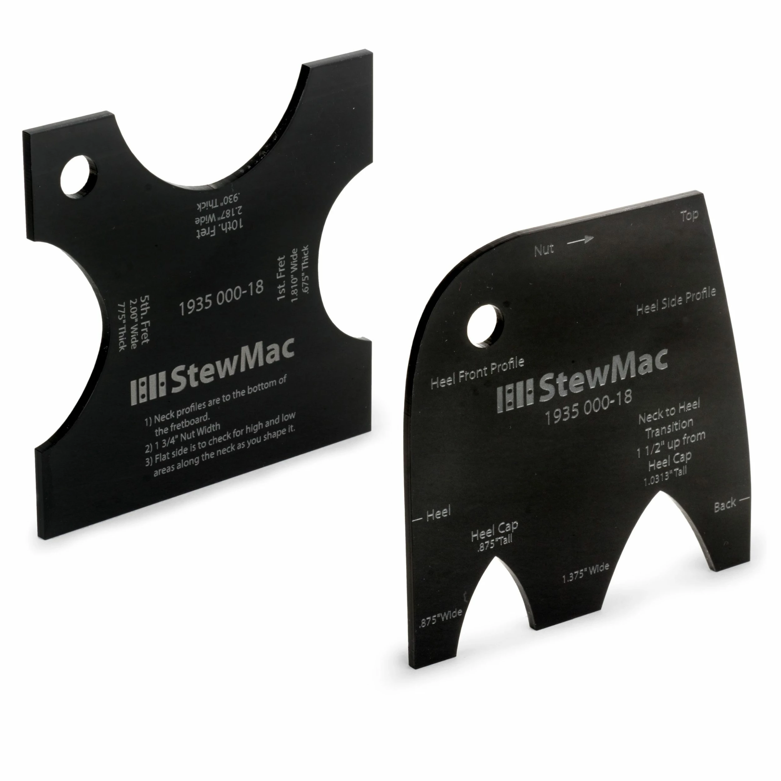 Everything you need to make perfect reproductions of sought after necks. These new templates have the exact contours of the neck shape from the 1st, 5th, and 10th frets, and several heel shapes. We also measured the thickness of the neck from the bottom of the fretboard, and etched the measurements on the tool.