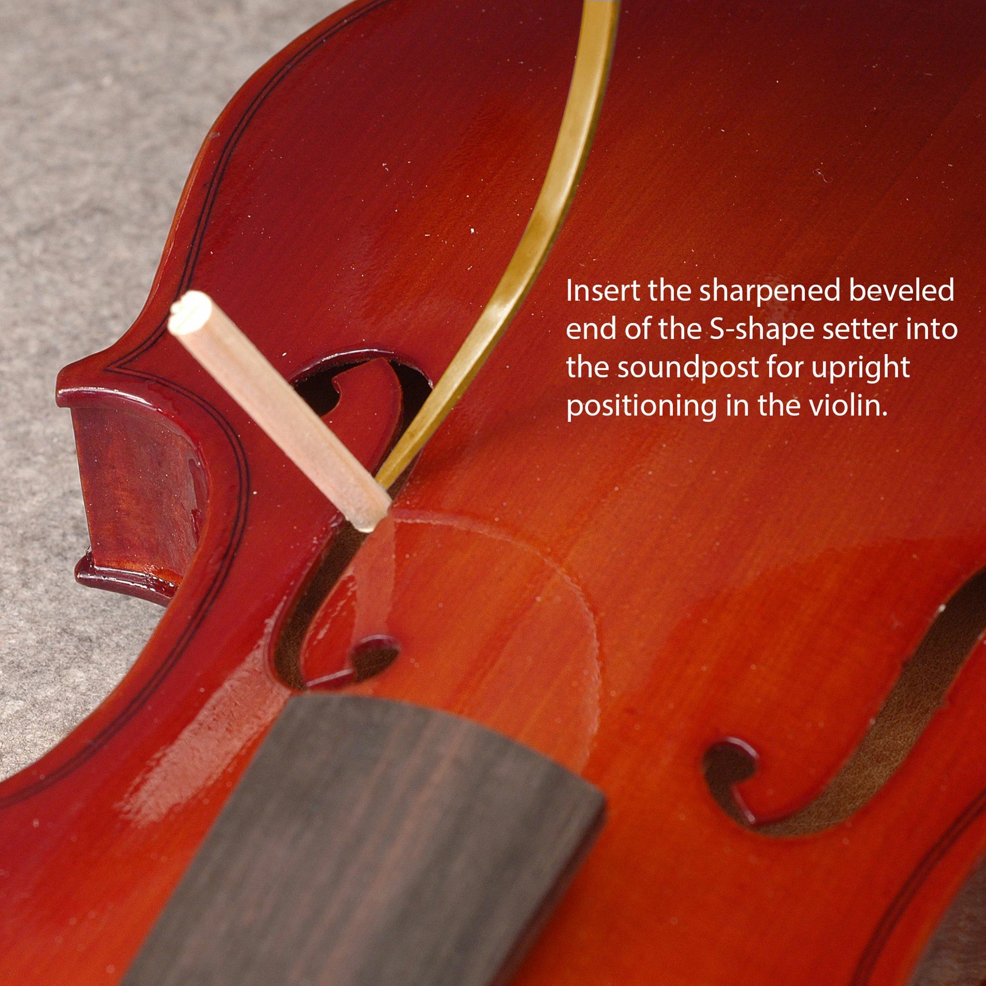 #0388 S-shaped Setter: Insert the sharpened beveled end into the soundpost for upright positioning in the violin. Use the notched end to help align the post into final position.