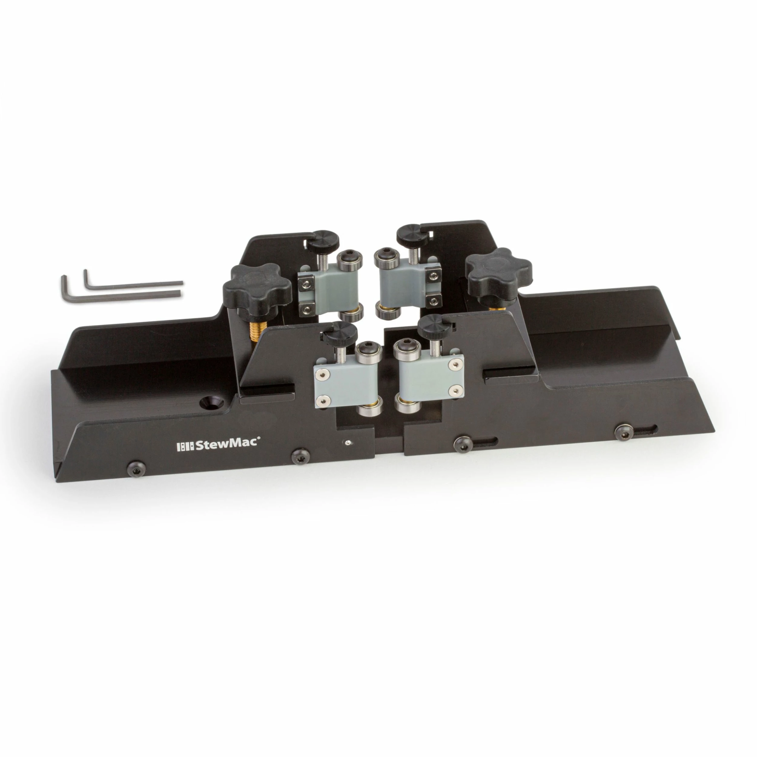 The Fret Slotting Miter Box accommodates fingerboards up to 1/2″ (12.70mm) thick and 2-7/8″ (73mm) wide. The box is rugged aluminum, 12″ (305mm) long. The aluminum has a durable anodized black finish. Hex wrenches are included for setting the rollers to fit your saw blade.