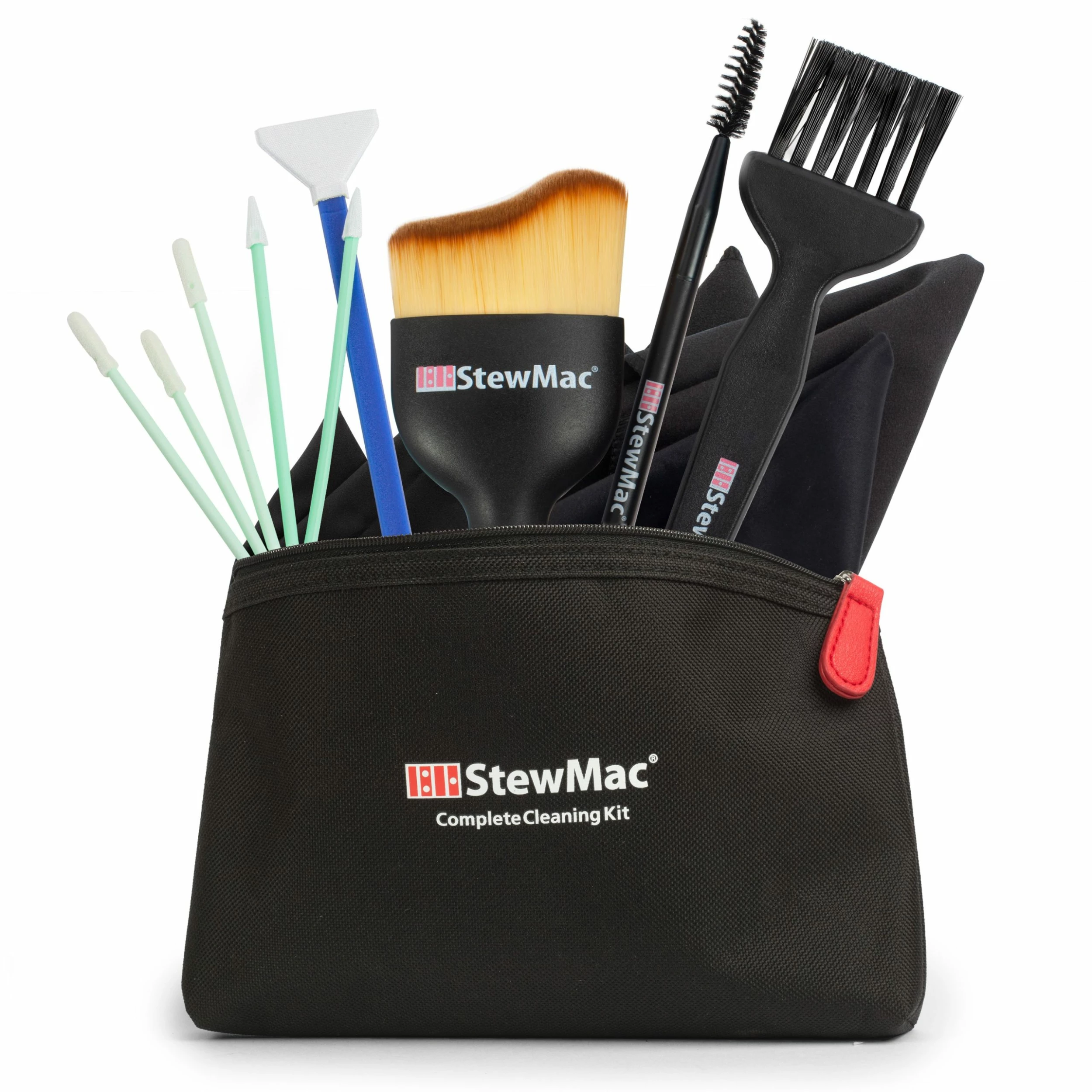 The variety of brushes and swabs make sure you will always have just the right tool to clean those hard-to-reach places around and underneath your hardware, and even in places like bridge pin holes or between saddles and springs. Also sold separately.