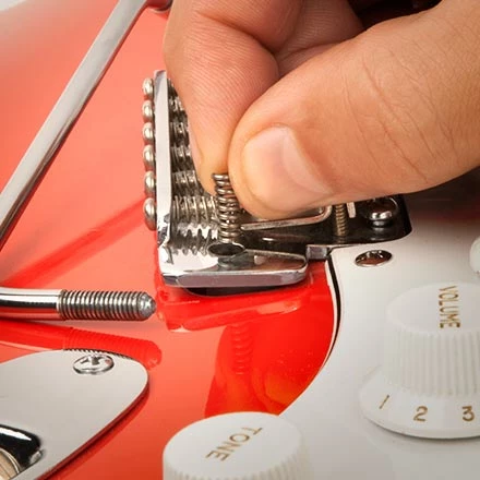 Screw the tremolo arm out of your bridge and drop the ball bearing in the hole. Drop the spring in next, and screw the arm back in place. That’s all there is to it.